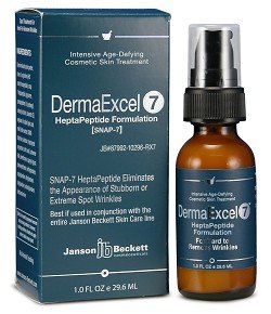 | Post Date : Apr 18, 2012 20:16:07 | Usually ships in 1-2 business daysIntroducing DermaExcel 7 the solution to stubborn or hard-to-remove wrinkles.As the understanding of the wrinkle formation process continues to advance so does our ability to impede this process. Wrinkles and their formation due to facial expressions, repetitive motions, environmental damage, and natural aging are no longer considered uncorrectable. Wrinkles have been proven to be preventable and reversible.DermaExcel 7 treats wrinkles by combining the three most advanced peptides.DermaExcel 7 is the first anti-wrinkle product to combine the three latest cutting-edge peptides in a single spot wrinkle treatment. DermaExcel 7 contains 5% PentaPeptide, 10% Acetyl HexaPeptide, and 10% HeptaPeptide, a Janson Beckett first. Each peptide interrupts the wrinkle producing SNARE complex differently but produces similar and collaborative results - Reduced depth of wrinkles and younger looking skin. DermaExcel 7 combats your deep wrinkles and augments the effects of AlphaDerma CEDermaExcel 7's formula is an evolutionary step in spot wrinkle prevention and repair targeted at eliminating the final deep wrinkles that resist AlphaDerma CE. By combining three cutting-edge peptides, along with Alpha Lipoic Acid, a powerful antioxidant, DMAE, a skin firmer, and Shea Butter, a superior skin moisturizer, Janson Beckett continues a multi-faceted approach to anti-wrinkle and anti-aging skin care.